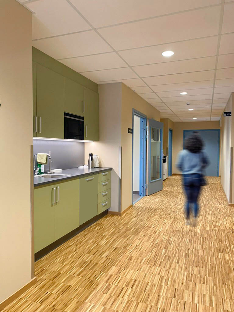 Vårt oppdrag bestod av innvendige farger, materialer og fast innredning, med unntak av løsøre. Møbler ble tatt hånd om av byggherre, og vi er glade for at de valgte en miljøvennlig løsning med gjenbruksmøbler.